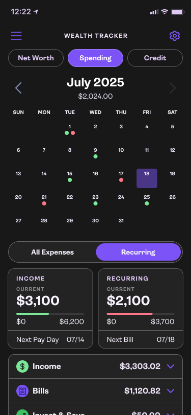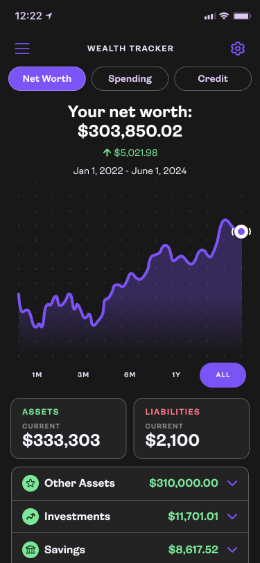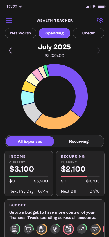 Wealth Tracker Dashboard:Spending summary gives a quick view into habits.