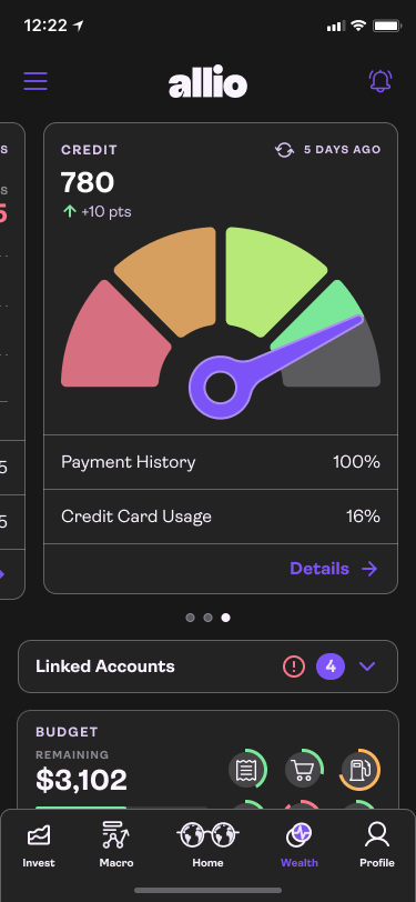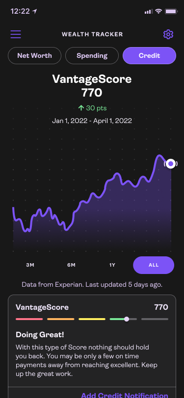 Wealth Tracker Dashboard:Credit monitoring shows long term financial responsibility.