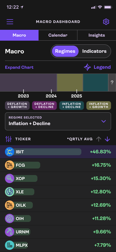 Macro Regimes are a base to macro investing, we can show ticker performance in each one.