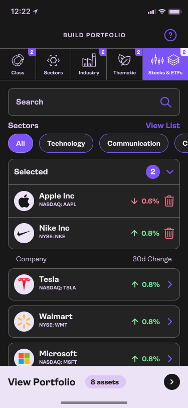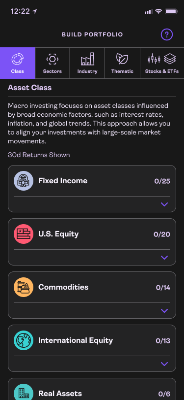 Custom portfolios are built with a step by step process, starting with asset classes.