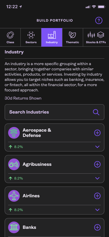 Instead of a client search for stocks and ETFs that fit industries we simplified.