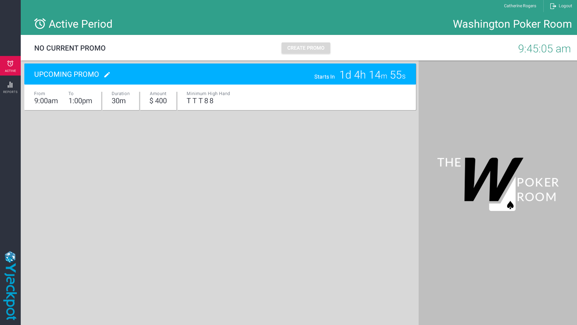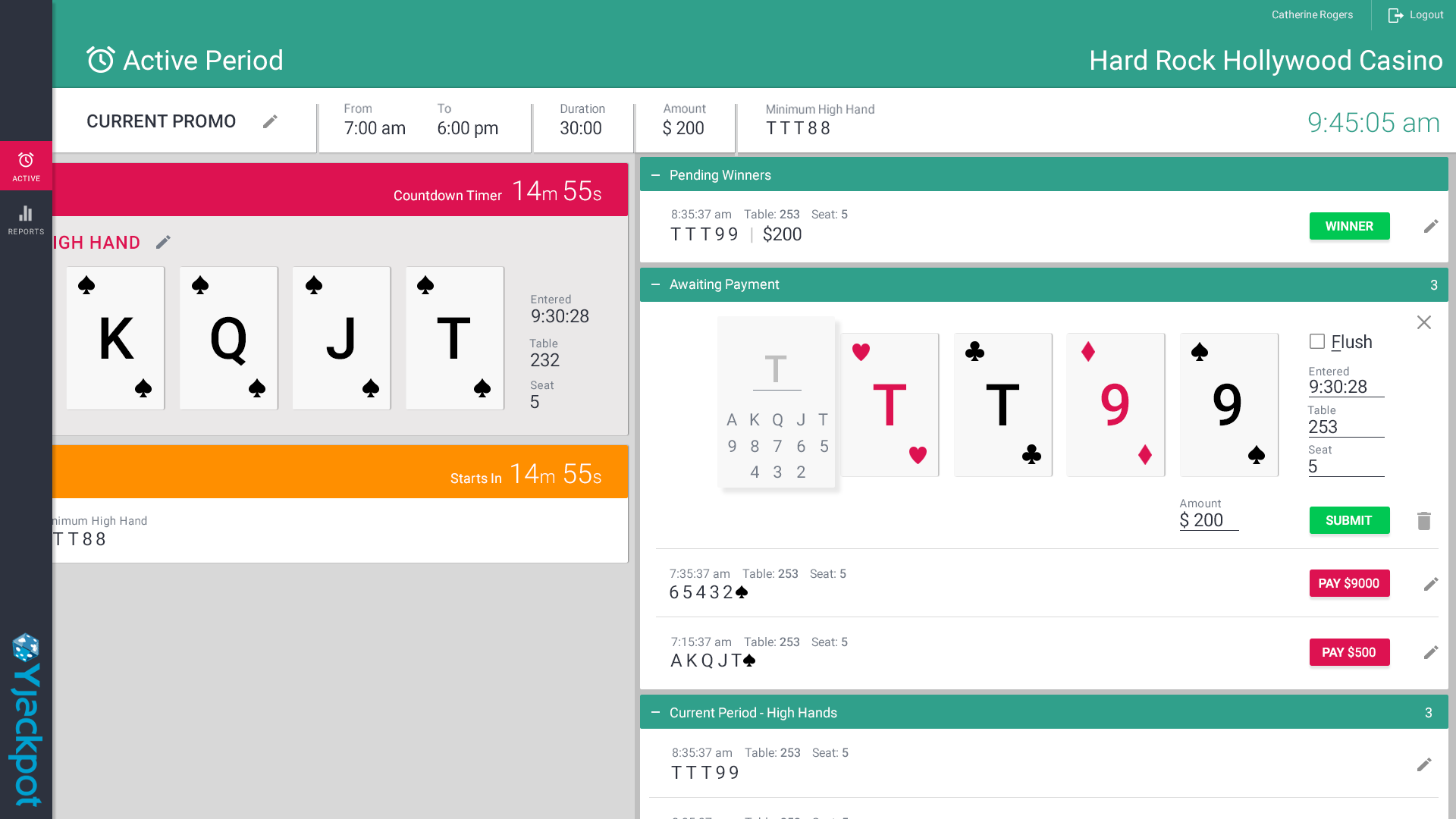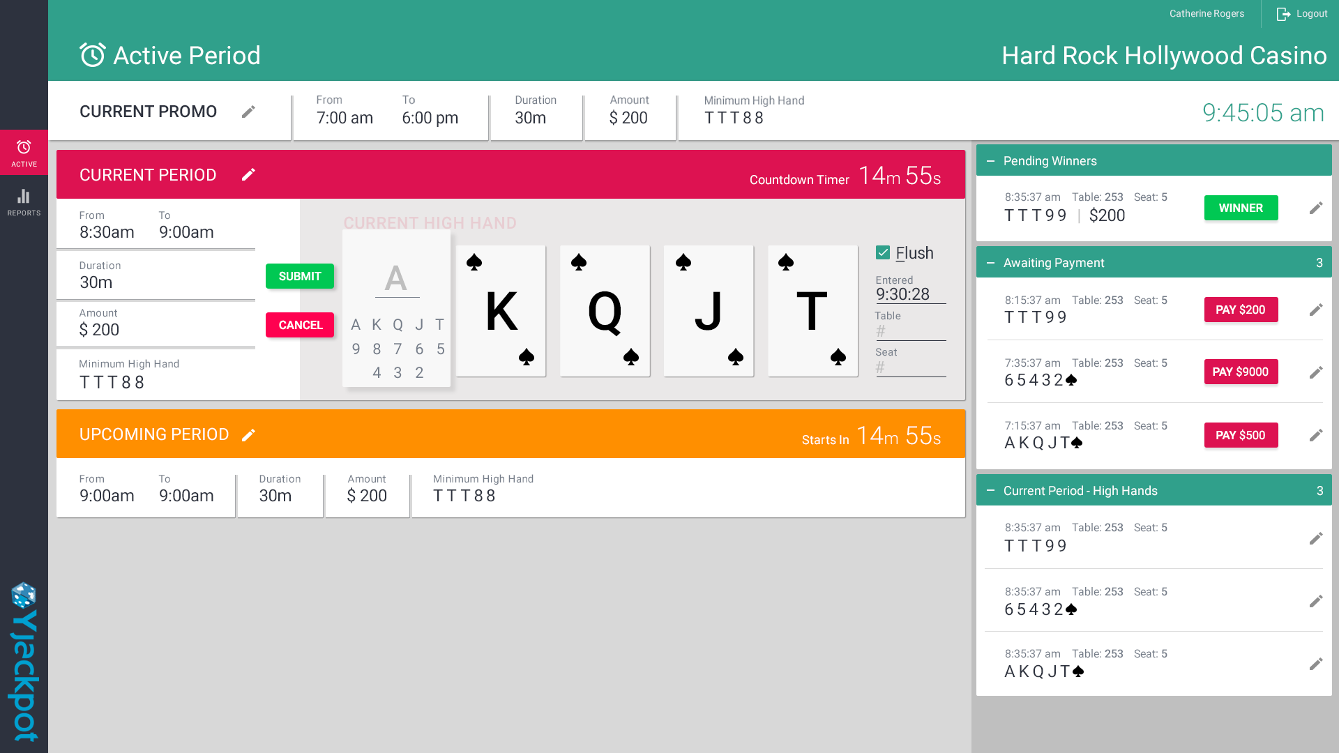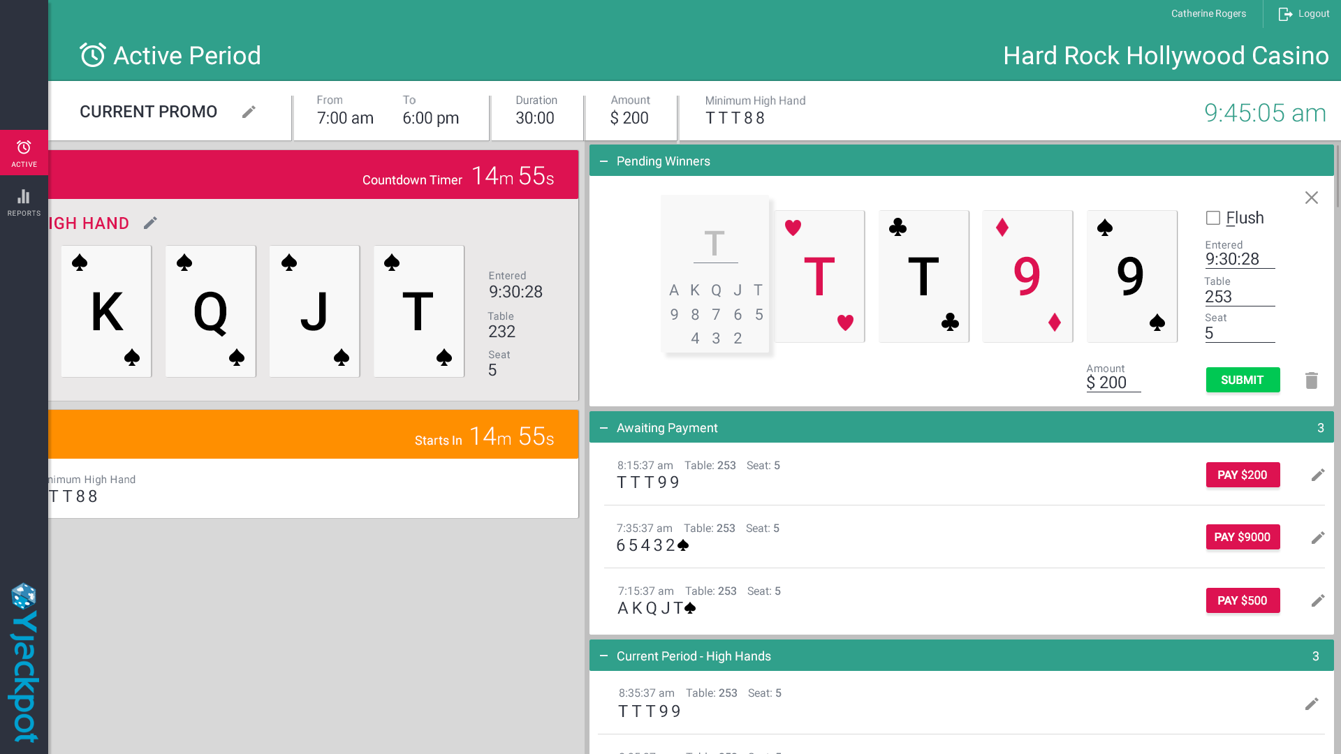 As a promo is running the floor staff needs to be able to quickly and easily manage the current hands. They will have access via their tablets or their computers at the main desk. Dealers will have a bluetooth button, under the table, to notify staff of high hand winners. As a new hand is put in the displays are updated to show the new hand to beat. If there is no promo in place the staff will see the time for the next one, at any time management can manually add a promo.