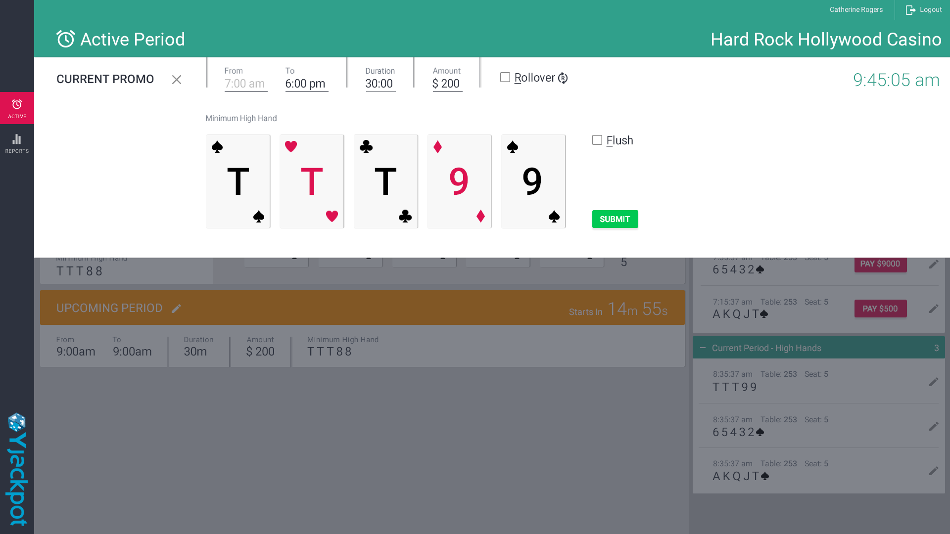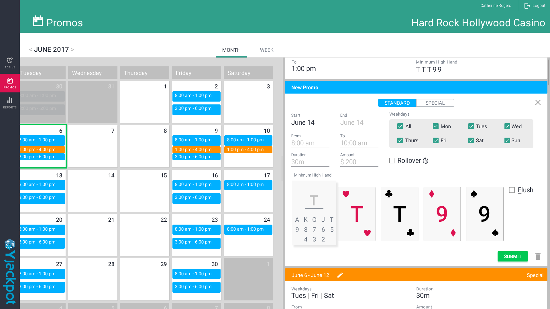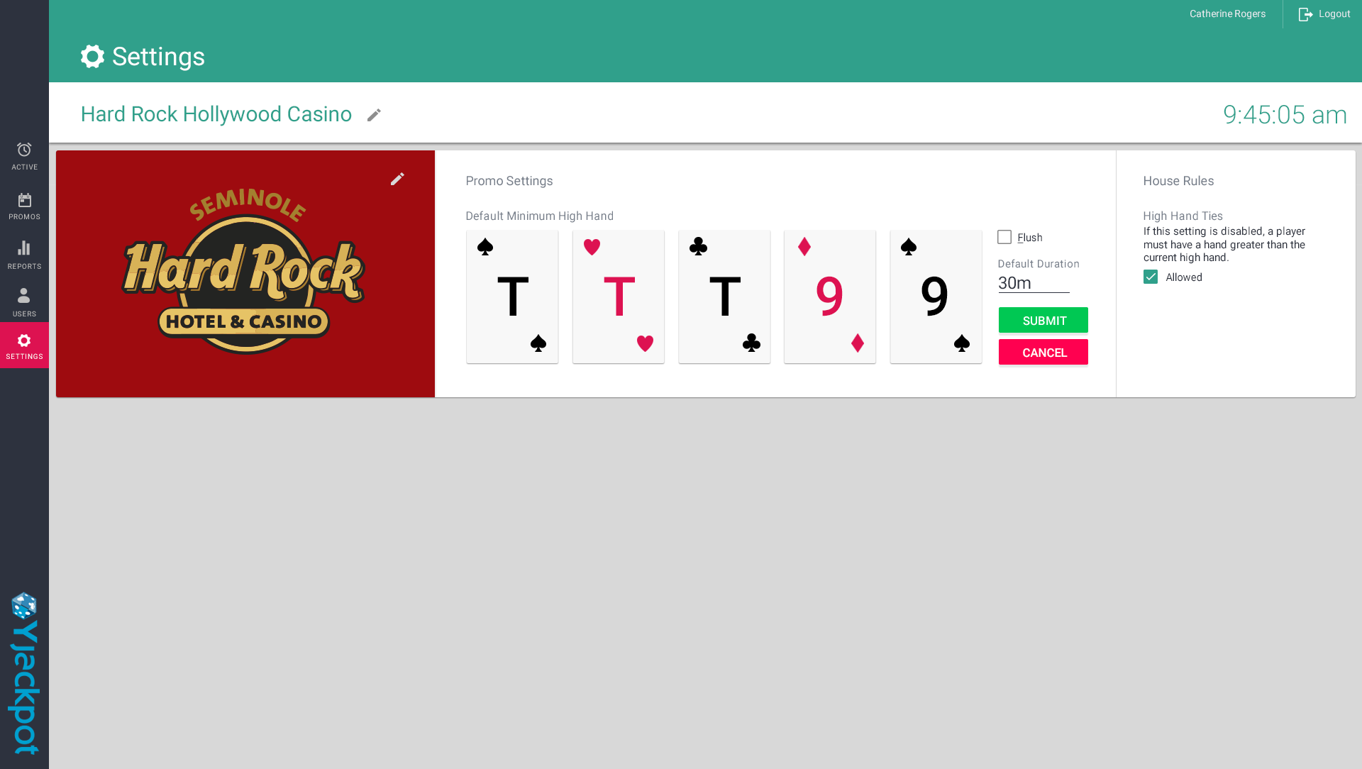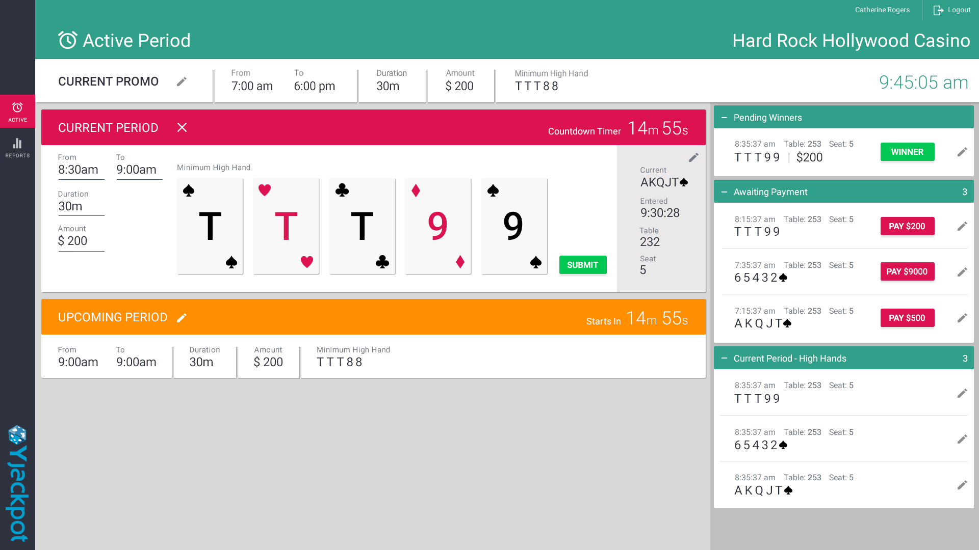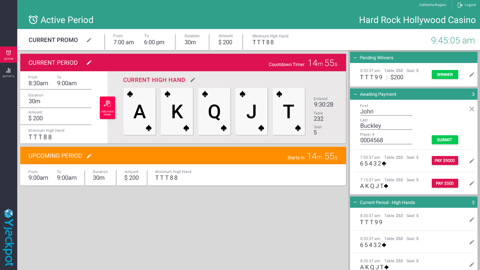 As a promo is running the floor staff needs to be able to quickly and easily manage the current hands. They will have access via their tablets or their computers at the main desk. Dealers will have a bluetooth button, under the table, to notify staff of high hand winners. As a new hand is put in the displays are updated to show the new hand to beat. If there is no promo in place the staff will see the time for the next one, at any time management can manually add a promo.